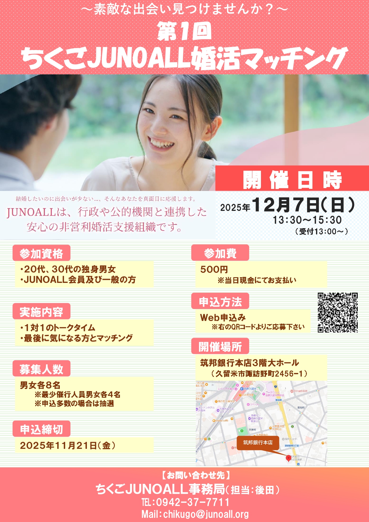 開催日2025年12月07日(日) 応募締切2025年11月21日(金) 参加資格20歳以上39歳以下の独身者 募集人数男女各8名(最少催行人数 男女4名)会場:筑邦銀行 本店 3階大ホール