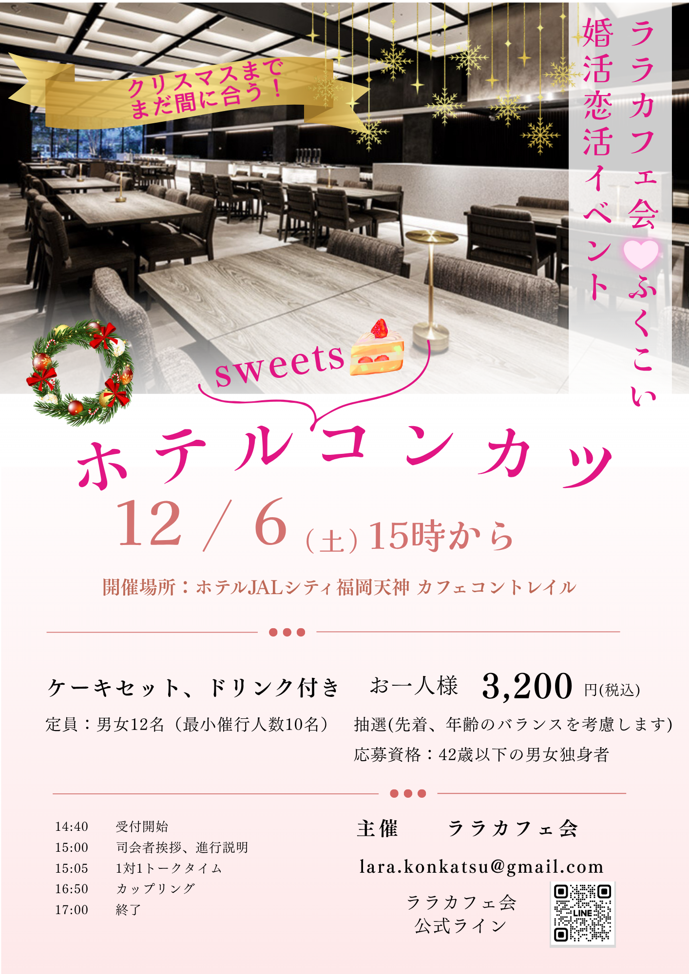 開催日2025年12月06日(土) 応募締切2025年11月28日(金) 参加資格42歳以下の男女独身者 募集人数男女各12名(最少催行人数男女各10名)会場:ホテルJALシティ福岡天神1階 カフェコントレイル内