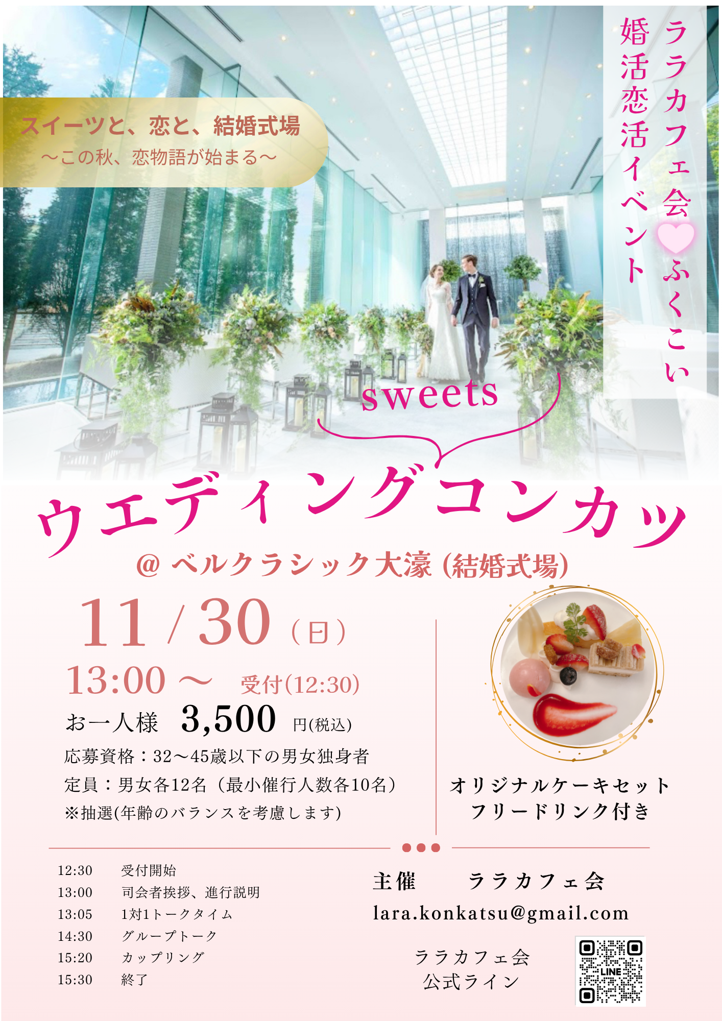 開催日2025年11月30日(日) 応募締切2025年11月21日(金) 参加資格32〜45歳以下の男女独身者 募集人数男女各12名(最少催行人数各10名)会場:ベルクラシック福岡大濠 披露宴会場