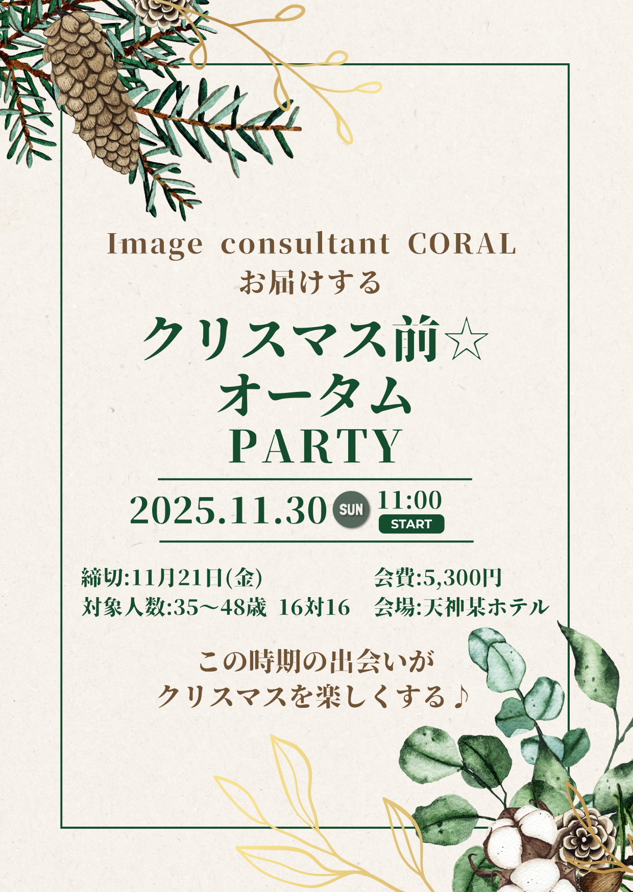 開催日2025年12月06日(土) 応募締切2025年11月24日(月) 参加資格42歳以下の独身女性 募集人数女性12名(最少催行人数男女各10名)会場:シアラ