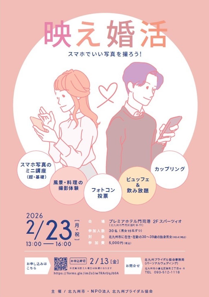 開催日2026年02月23日(月) 応募締切2026年02月13日(金) 参加資格30歳~39歳の独身者 北九州市に在勤・在住の方 募集人数男女各15名(最少催行人数 男女各5名)会場:プレミアホテル門司港 2Fスパーツィオ