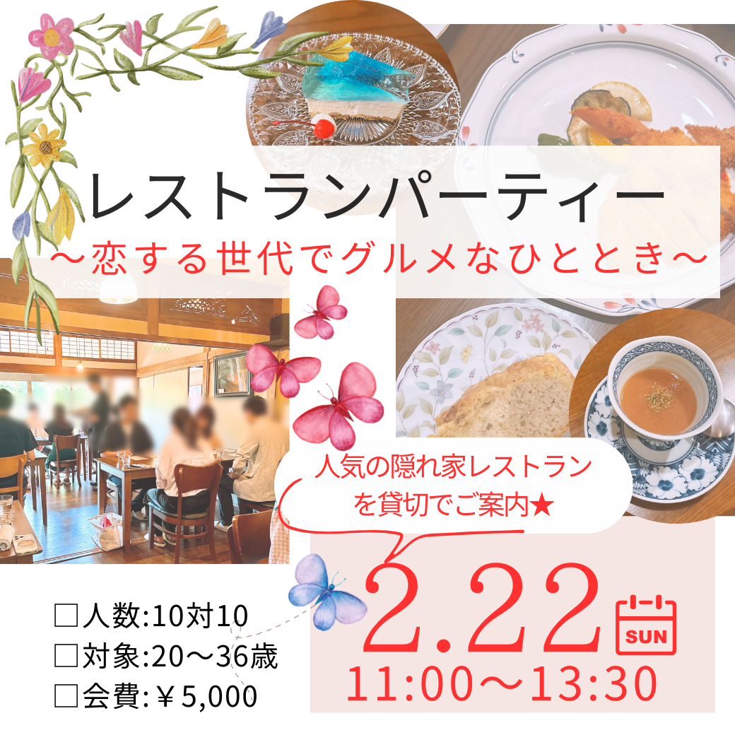 開催日2026年02月22日(日) 応募締切2026年02月13日(金) 参加資格20~36歳以下の独身者 募集人数男女各10名(最少催行人数男女各9名)会場:シークレットレストランK