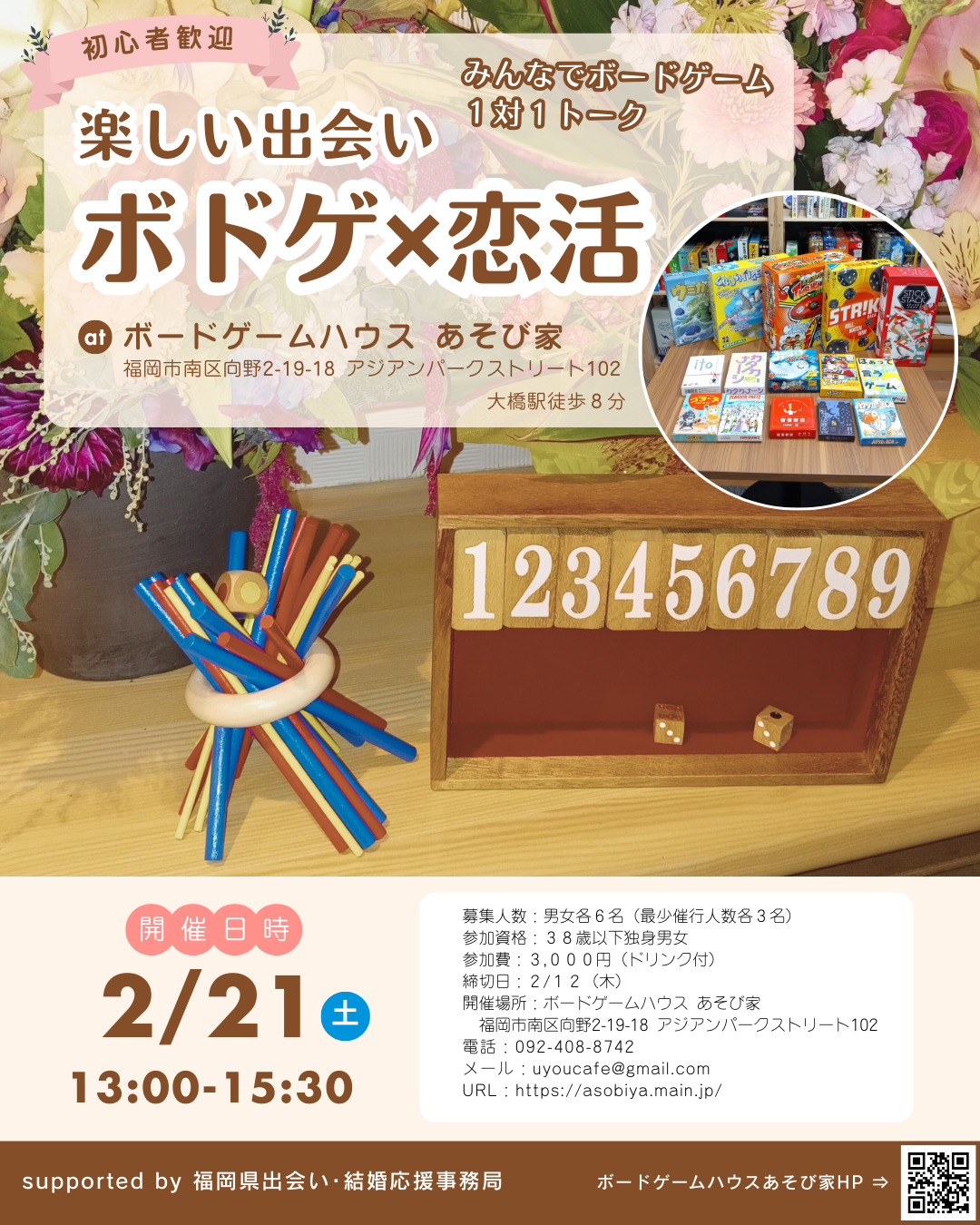 開催日2026年02月21日(土) 応募締切2026年02月12日(木) 参加資格38歳以下の独身男女 募集人数男女各6名(最少催行人数各3名)会場:ボードゲームハウス あそび家
