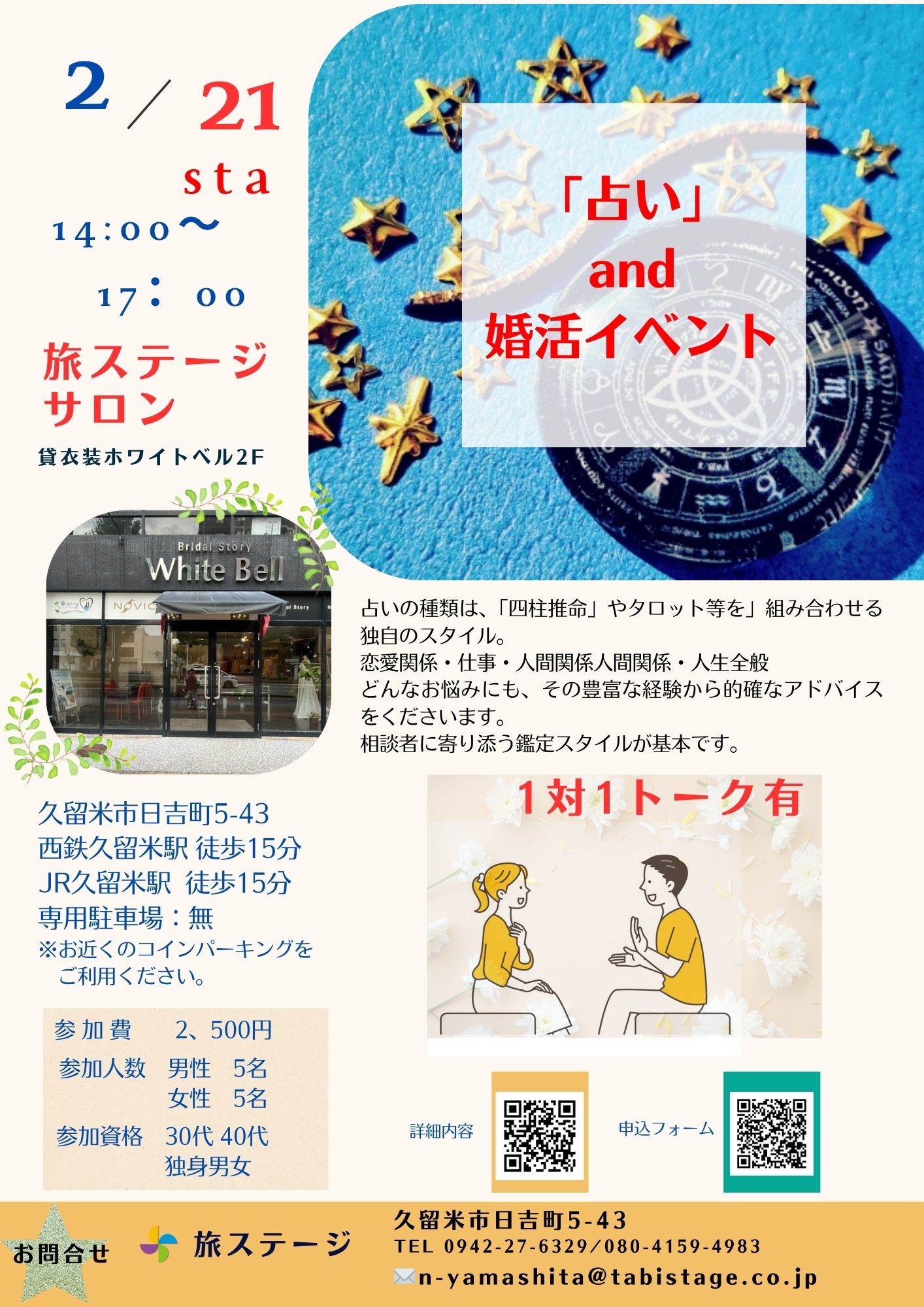 開催日2026年02月21日(土) 応募締切2026年02月14日(土) 参加資格30代 40代 の独身者 募集人数男女各5名(最少催行人数男女各3名)会場:旅ステージサロン(貸衣装ホワイトベル内)