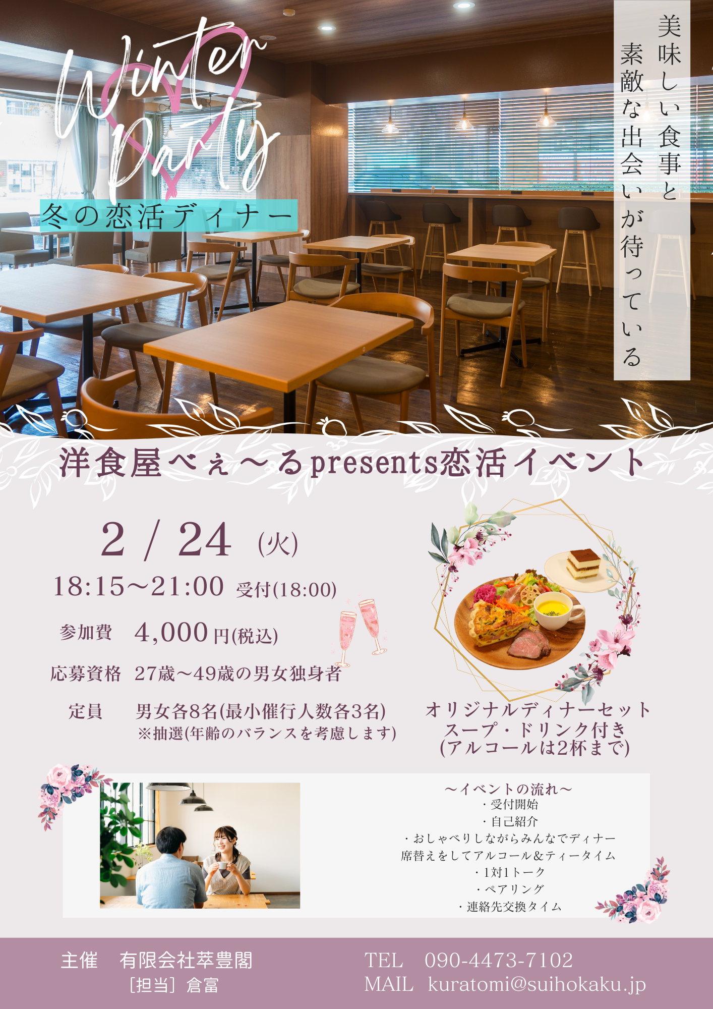 開催日2026年02月24日(火) 応募締切2026年02月17日(火) 参加資格27歳〜49歳までの独身者 募集人数男女各8名(最少催行男女各3名)会場:洋食屋べぇーる