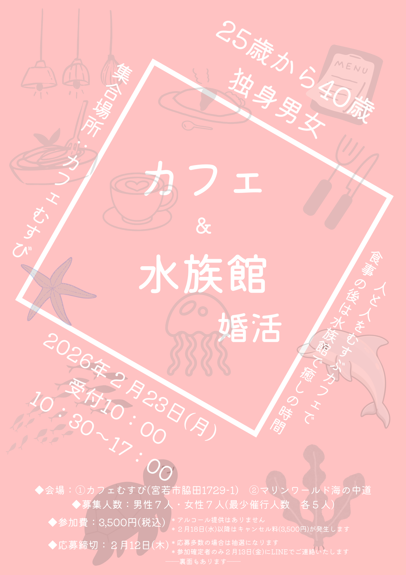 開催日2026年02月23日(月) 応募締切2026年02月12日(木) 参加資格25歳~40歳以下の独身者 募集人数男女各7名(最小催行人数各5名)会場:カフェむすび