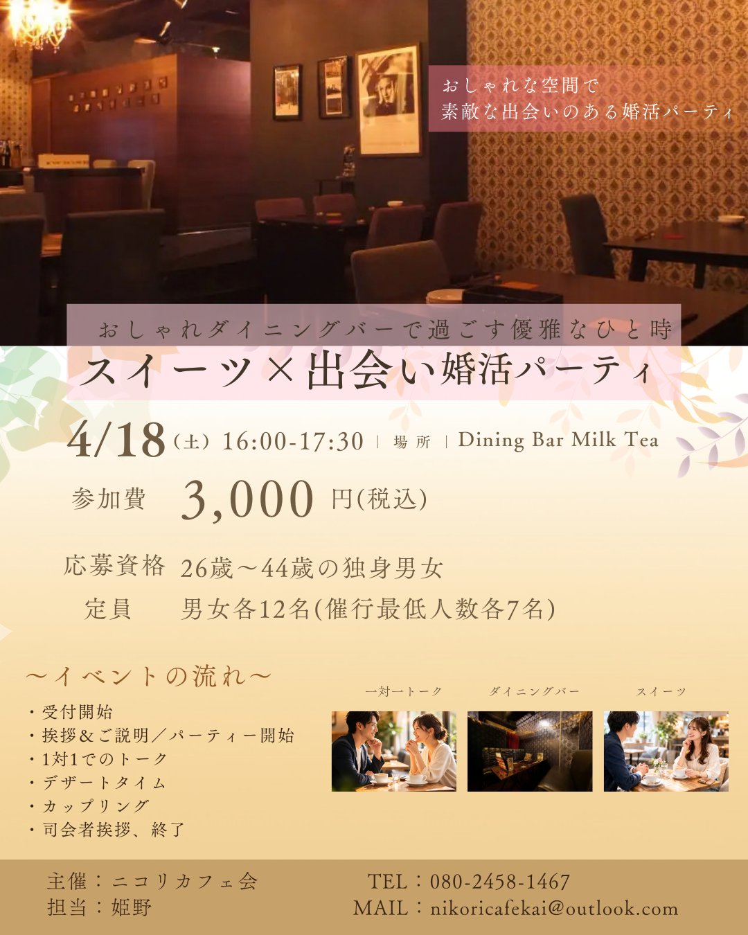 開催日2026年04月18日(土) 応募締切2026年04月10日(金) 参加資格26~44歳以下の独身者 募集人数男女各12名(最少催行人数 男女各7名)会場:Dining Bar Milk Tea