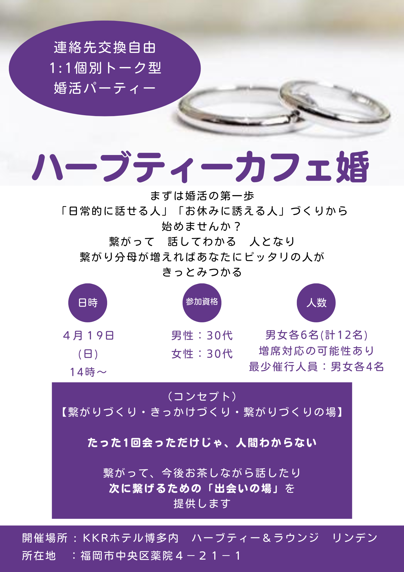 開催日2026年04月19日(日) 応募締切2026年04月08日(水) 参加資格30~39歳の独身者 募集人数男女各6名(最少催行人数男女各4名)会場:KKRホテル博多 内 ハーブティー&ラウンジ リンデン