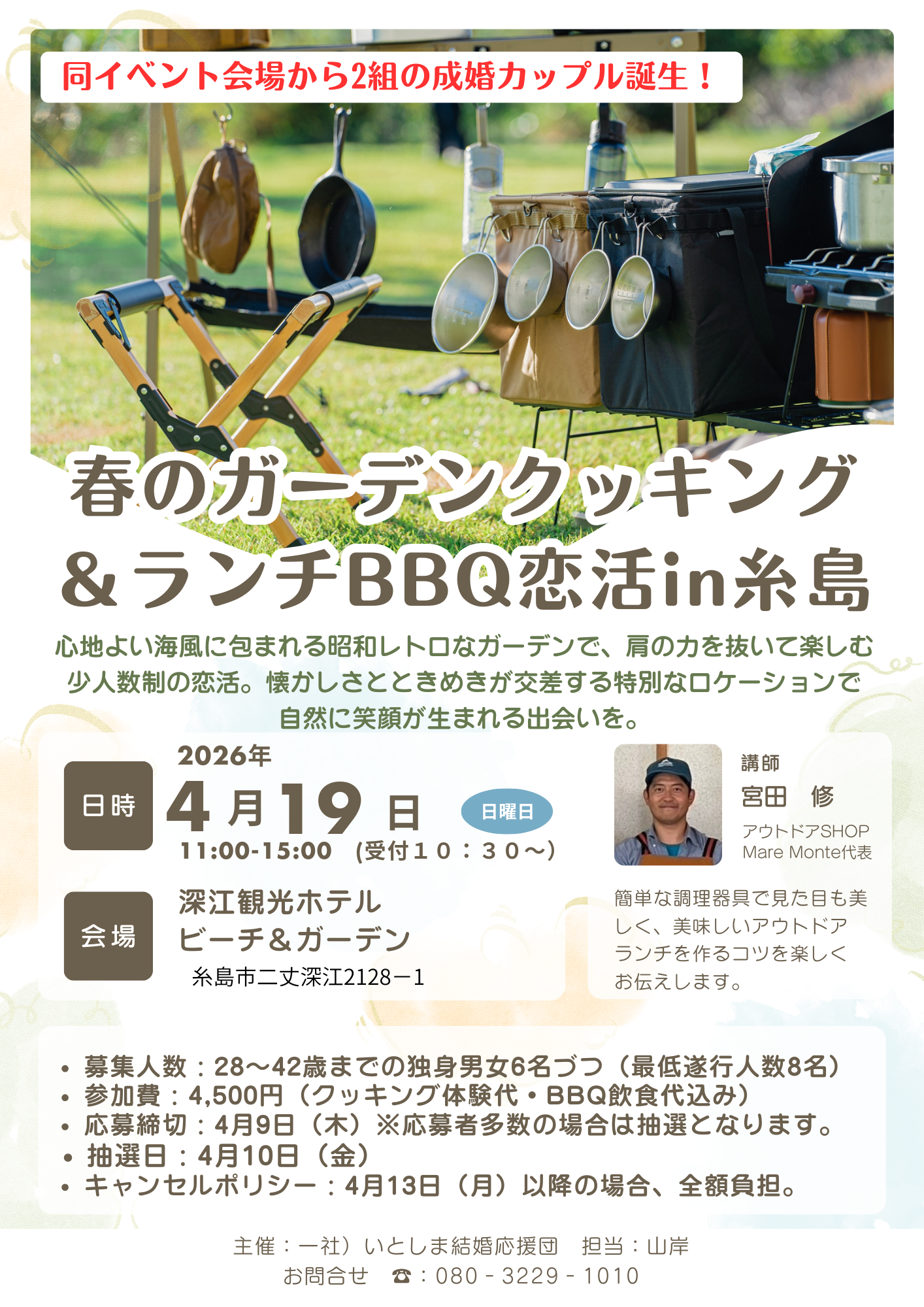 開催日2026年04月19日(日) 応募締切2026年04月09日(木) 参加資格28~42歳以下の独身者 募集人数男女各6名(最少催行人数男女各4名)会場:深江観光ホテル 敷地内ガーデン&海の家