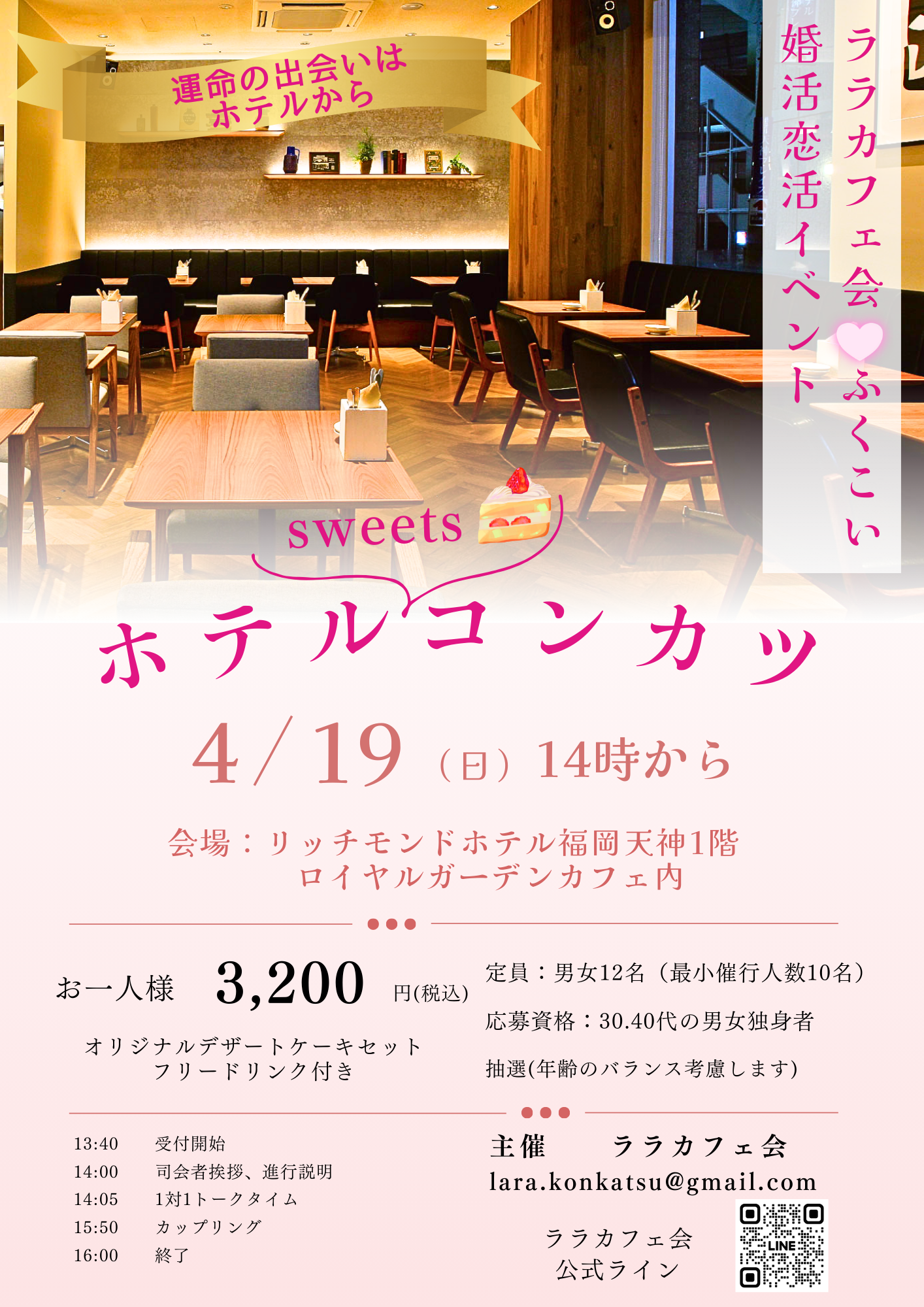 開催日2026年04月19日(日) 応募締切2026年04月10日(金) 参加資格30代、40代の独身者 募集人数男女各12名(最少催行人数男女各10名)会場:リッチモンドホテル福岡天神1階 ロイヤルガーデンカフェ内