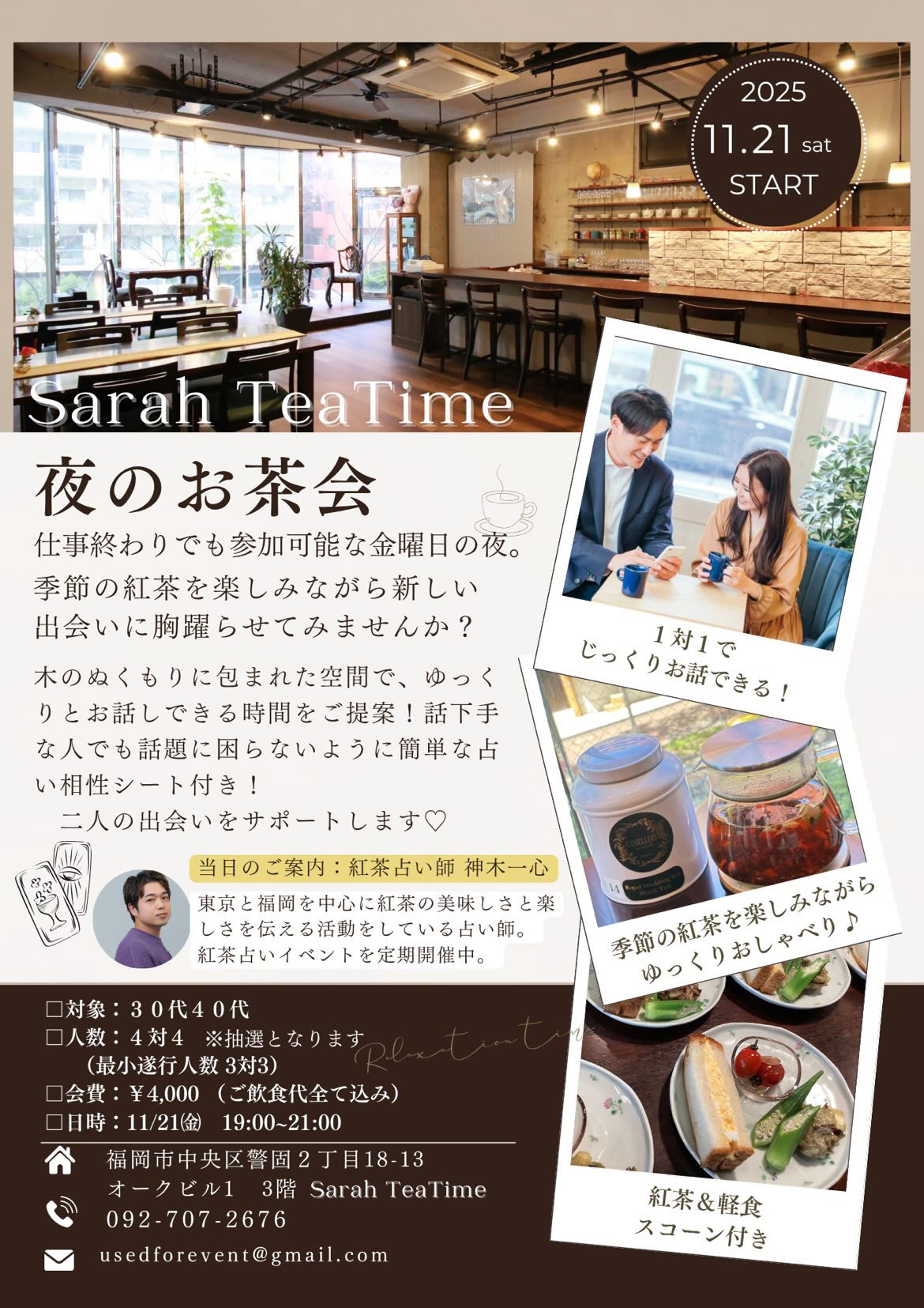 開催日2025年11月21日(金) 応募締切2025年11月12日(水) 参加資格40歳以下の独身者 募集人数男女各4名(最少催行人数 男女3名)会場:Sarah TEA TIME