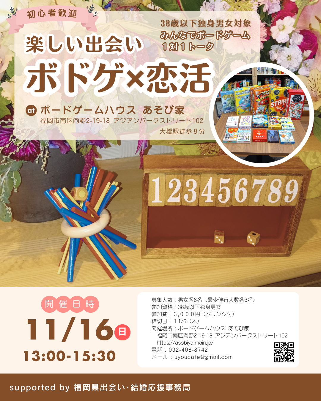 開催日2025年11月16日(日) 応募締切2025年11月06日(木) 参加資格38歳以下の独身男女 募集人数男女各8名(最少催行人数各3名)会場:ボードゲームハウス あそび家