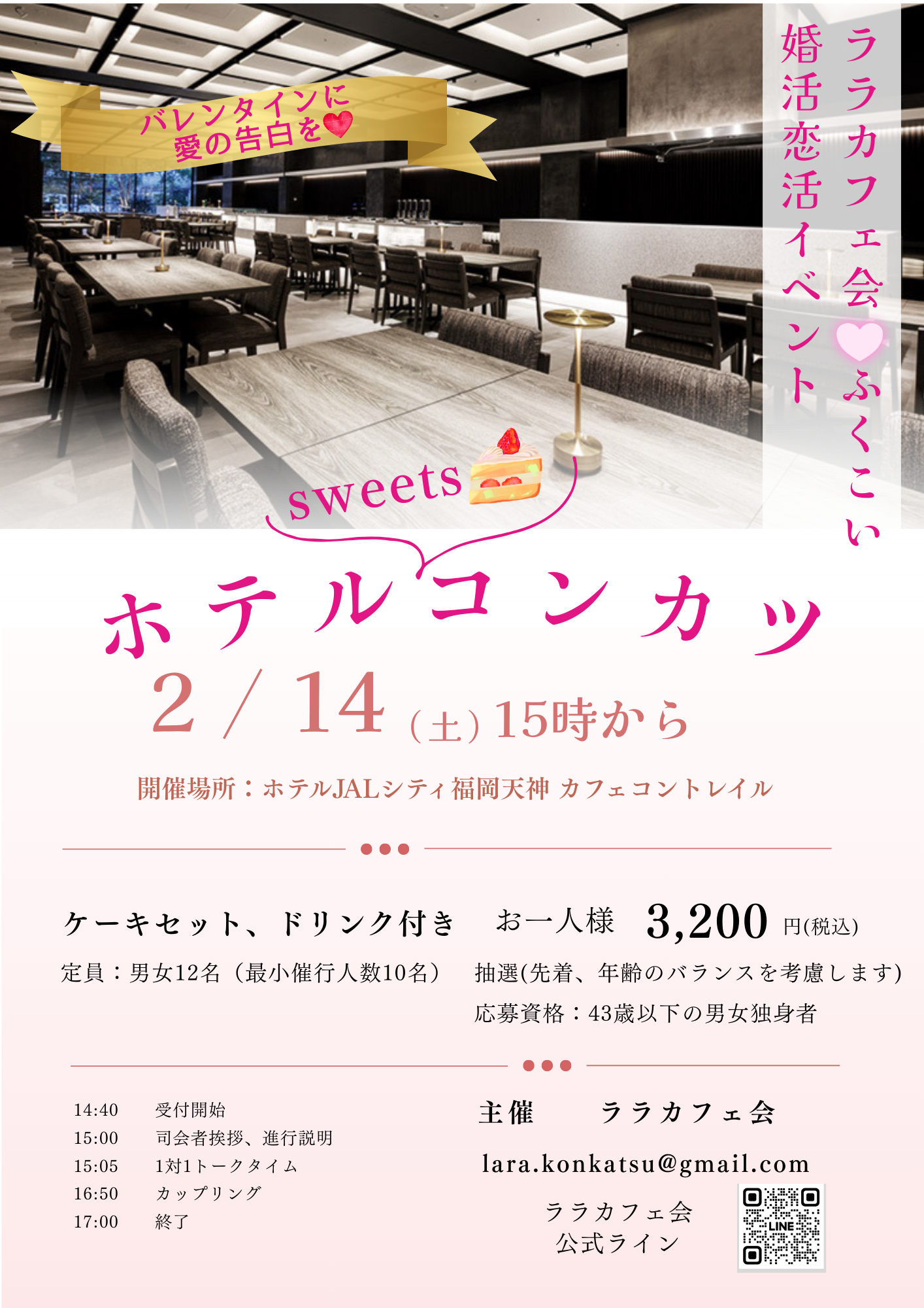 開催日2026年02月14日(土) 応募締切2026年02月06日(金) 参加資格43歳以下の男女独身者 募集人数男女各12名(最少催行人数男女各10名)会場:ホテルJALシティ福岡天神1階 カフェコントレイル内