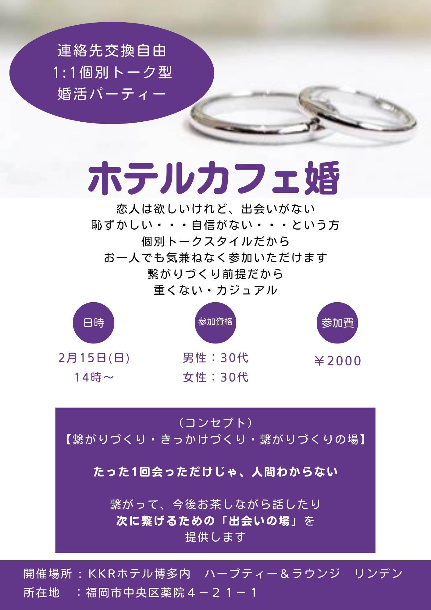 開催日2026年02月15日(日) 応募締切2026年02月04日(水) 参加資格30~39歳の独身者 募集人数男女各6名(最少催行人数男女各4名)会場:KKRホテル博多 内 ハーブティー&ラウンジ リンデン