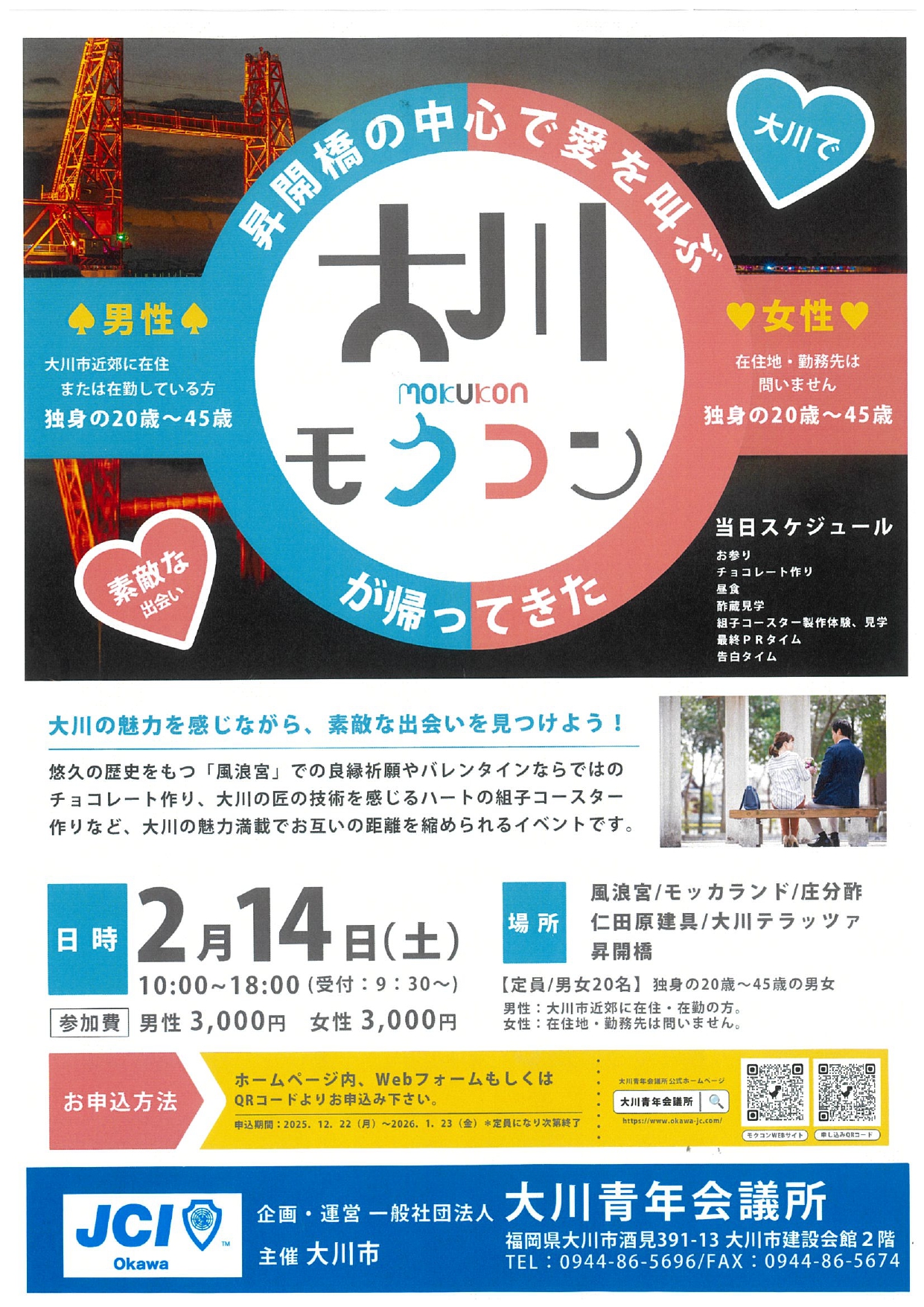 開催日2026年02月14日(土) 応募締切2026年01月23日(金) 参加資格20歳から45歳までの独身者 募集人数男女各20名(最少催行人数男女各15名)会場:大川市内各所 (風浪宮、モッカランド、庄分酢、仁田原建具、大川テラッツァ、筑後川昇開橋)